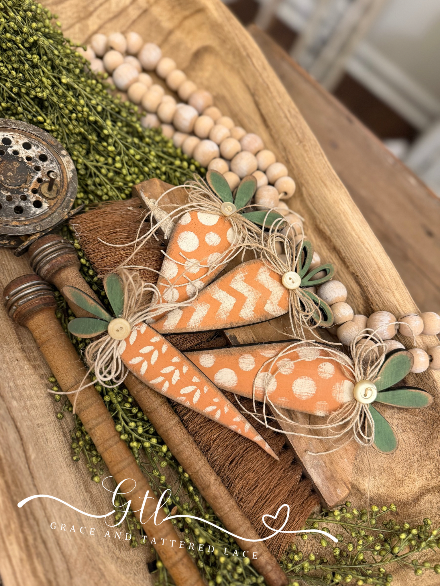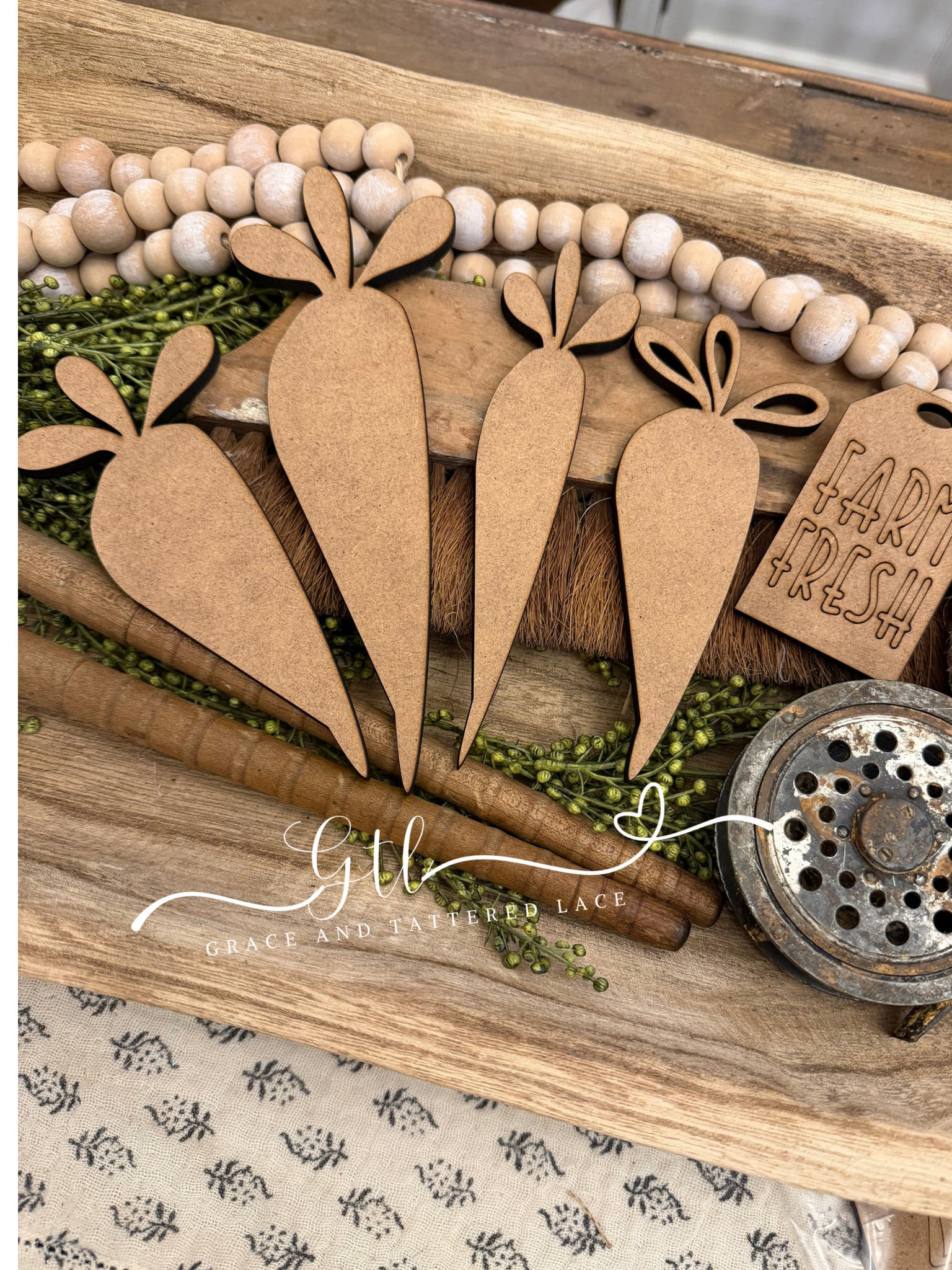 Cute Wonky Carrots to go with the interchangeable breadboard DIY kit is ready for you to customize and fit your style! The carrots vary in size is approximately 7.2" x 2.4", 2.5" x 5.8" (2), and 6.5" x 1.6". This is the Carrot/tag kit only!!! Faux chicken wire cutting board is sold separately!