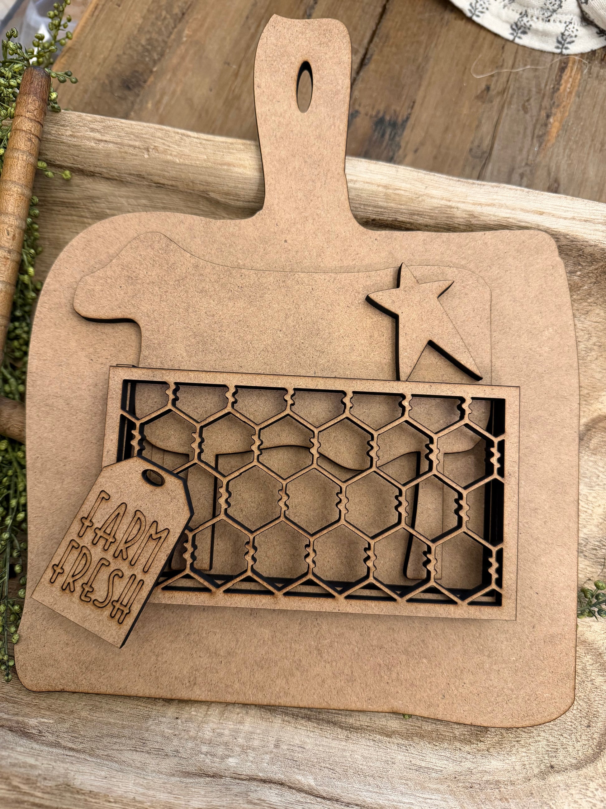 Cute cow to go with the interchangeable breadboard DIY kit is ready for you to customize and fit your style! The cow is approximately 5.5” x 7". This is the cow/tag kit only!!! Faux chicken wire cutting board is sold separately!